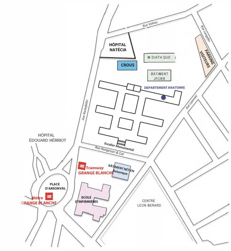- Directions Metro ligne D «Grange-Blanche», then walk 5 min to the «Faculté de Médecine Lyon Est».
