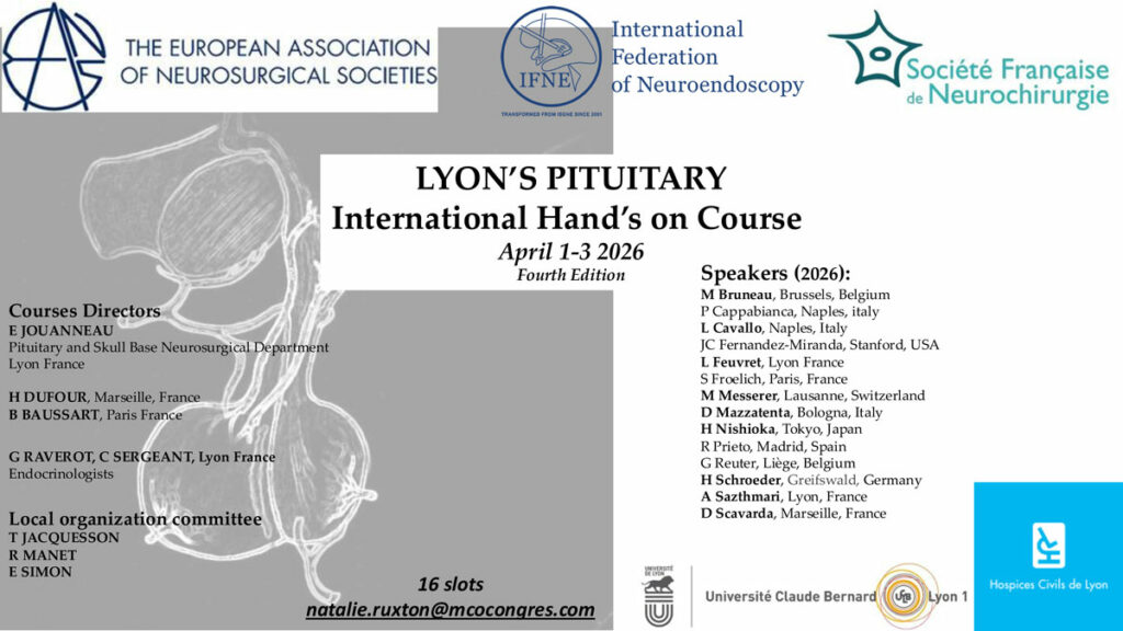 It is my great pleasure to invite you, both participants and faculties, for the fourth EANS – SFNC Masterclass and Hands-On Course focused on Pituitary Tumors. The course will take place in the modern facilities either of the University Campus and the Neurological Hospital of Lyon, France.